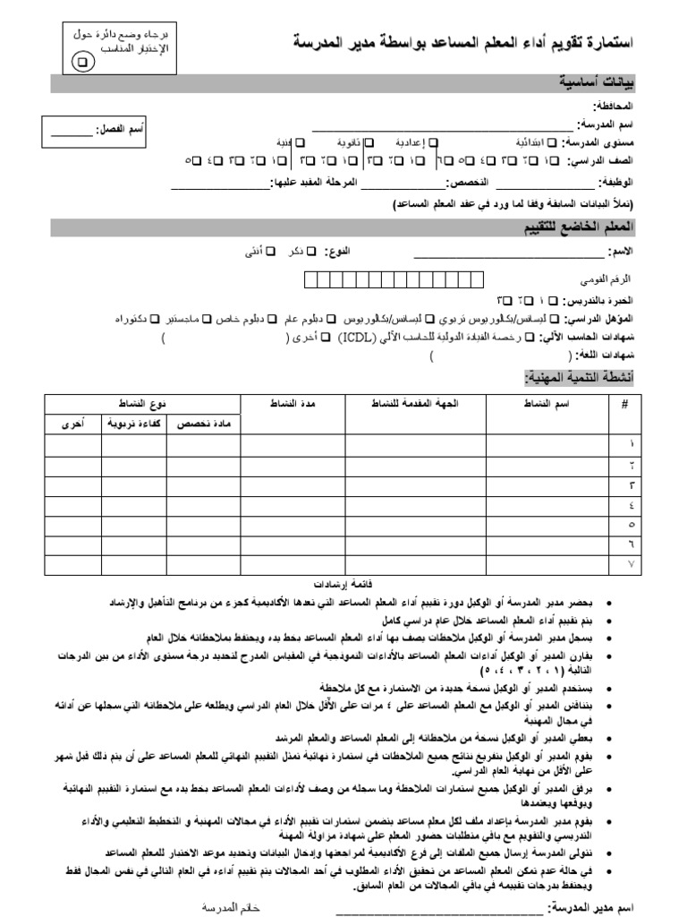 استمارة تقويم أداء المعلم بواسطة مدير المدرسة