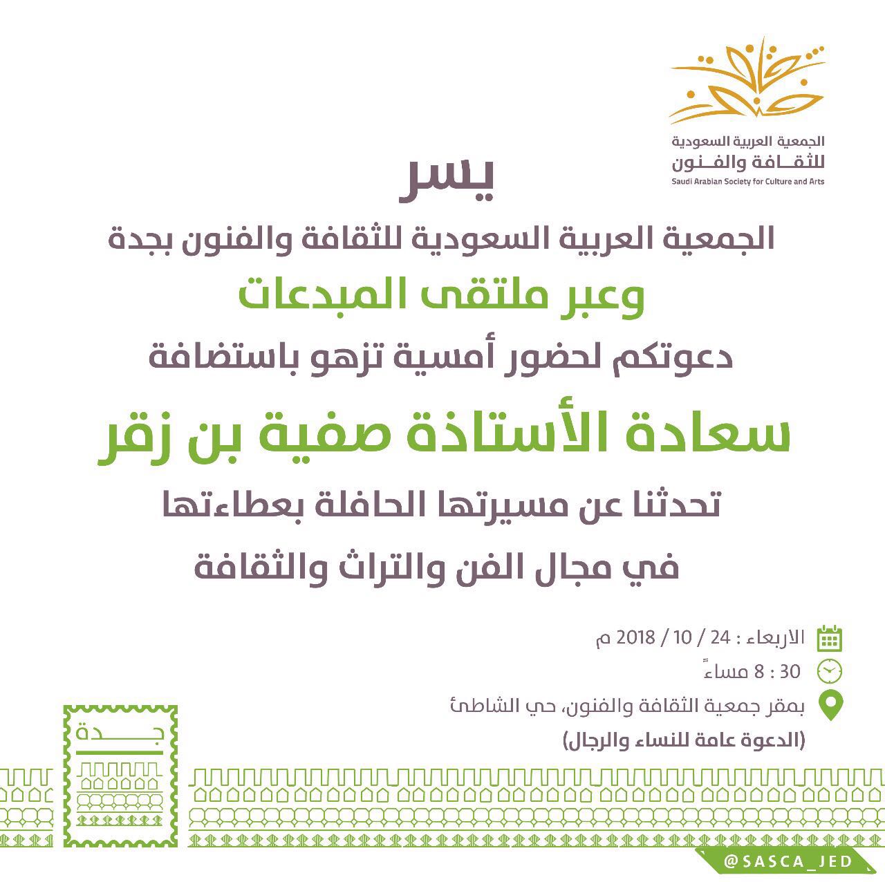 جمعية الثقافة والفنون بجدة V Twitter تدعوكم جمعية الثقافة والفنون بجدة لحضور أمسية ملتقى المبدعات مع رائدة الفننون التشكيلية صفية بن زقر يوم الاربعاء 2018 10 24 الساعة8 30 مساء في مقر الجمعية بحي الشاطئ Https T Co X5jeohnzpr