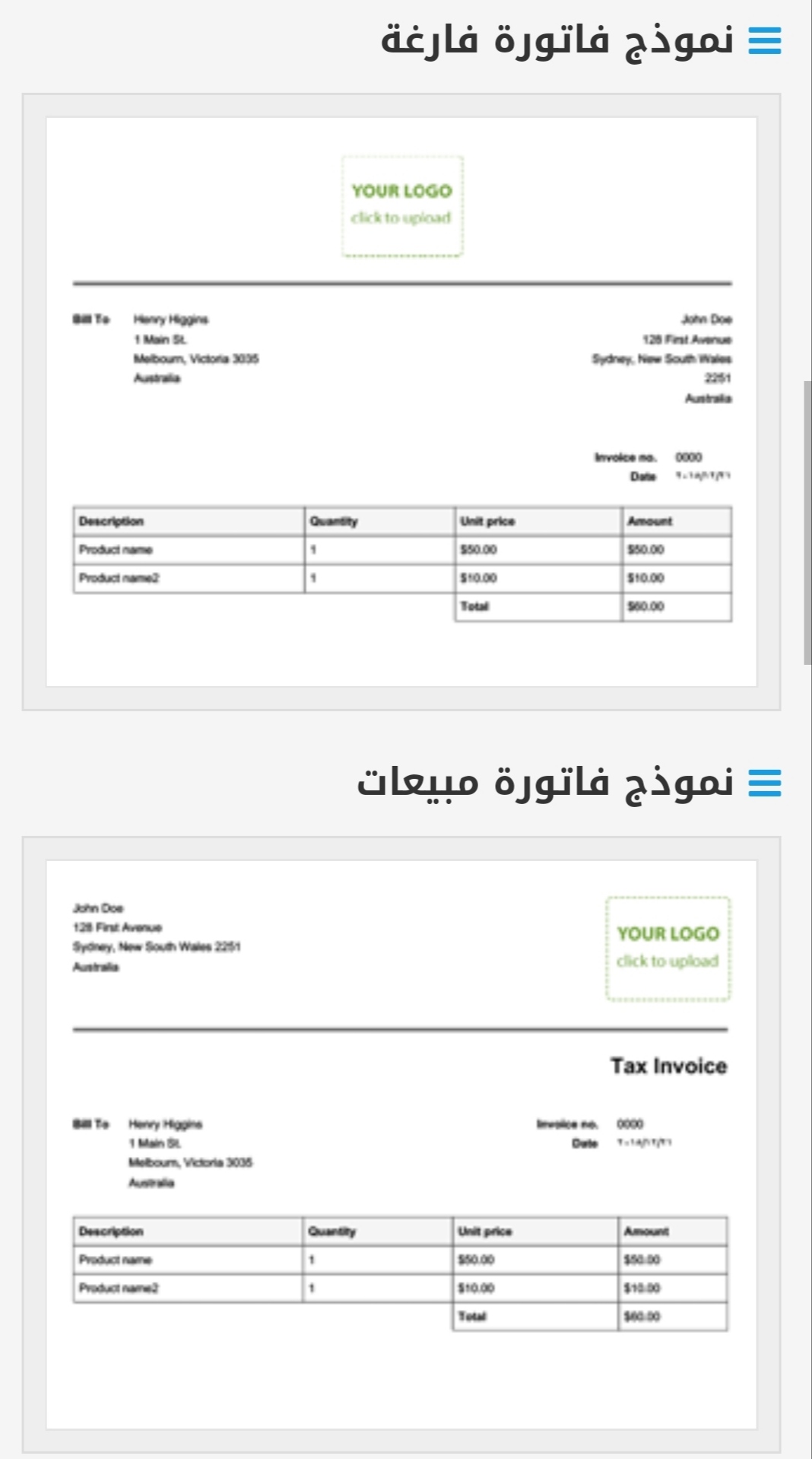 نماذج فواتير فارغة Word باللغة العربية والانجليزية
